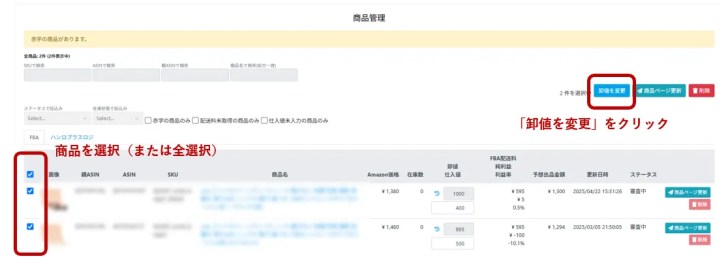 また、商品管理画面にて「FBAマルチチャネル配送料」は自動で表示され、「卸値」と「仕入値」をご入力いただくことでハンロプラスでの商品の「利益額」「利益率」が自動で計算されます。